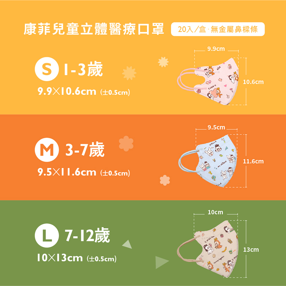 規格:兒童立體約 10 x 13 cm (±0.5cm) / 無鼻樑條