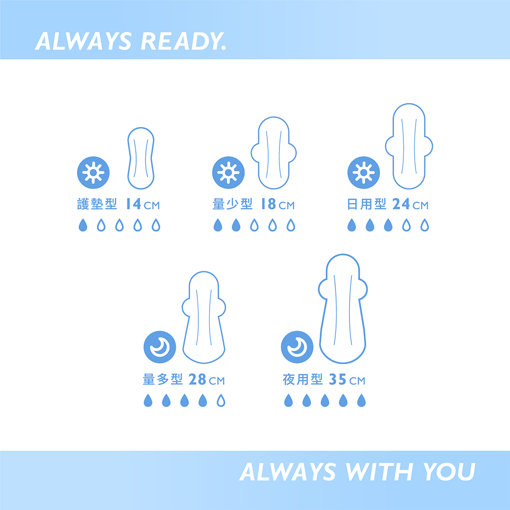 護墊型14cm / 量少型18cm / 日用型24cm / 量多型28cm / 夜用型35cm